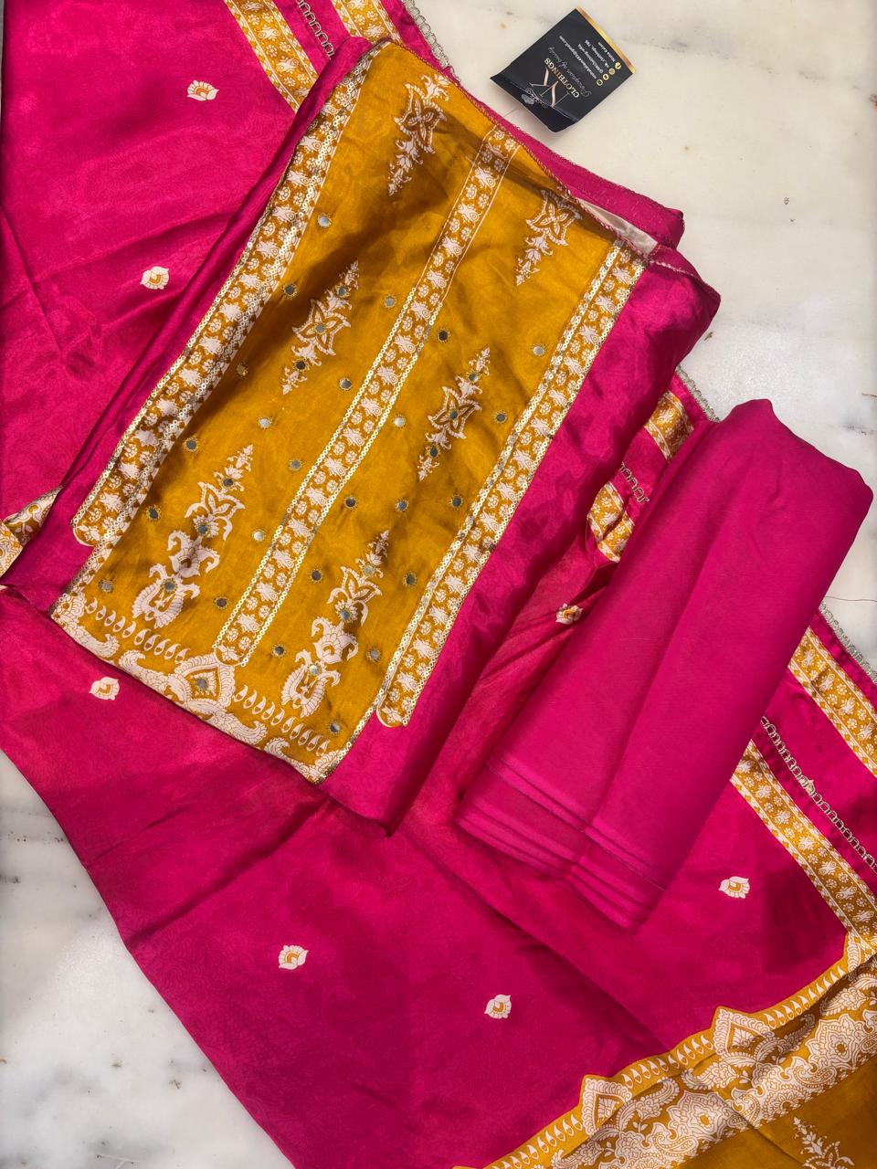 Stylish Gajji silk suit set featuring embroidery and vibrant colors for a premium look.