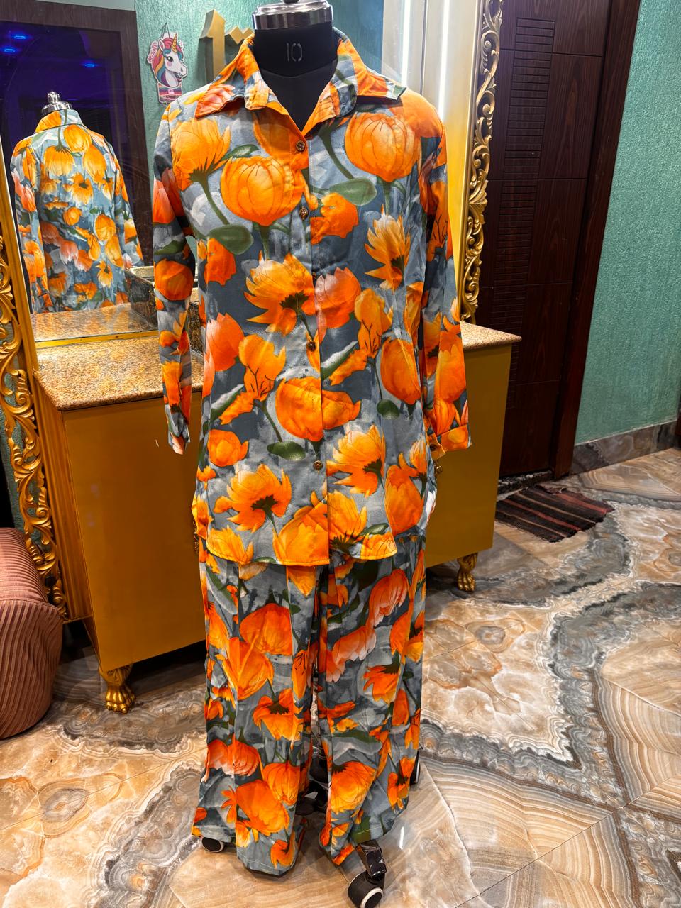 Stylish orange floral printed co-ord set perfect for casual outings and daily wear.