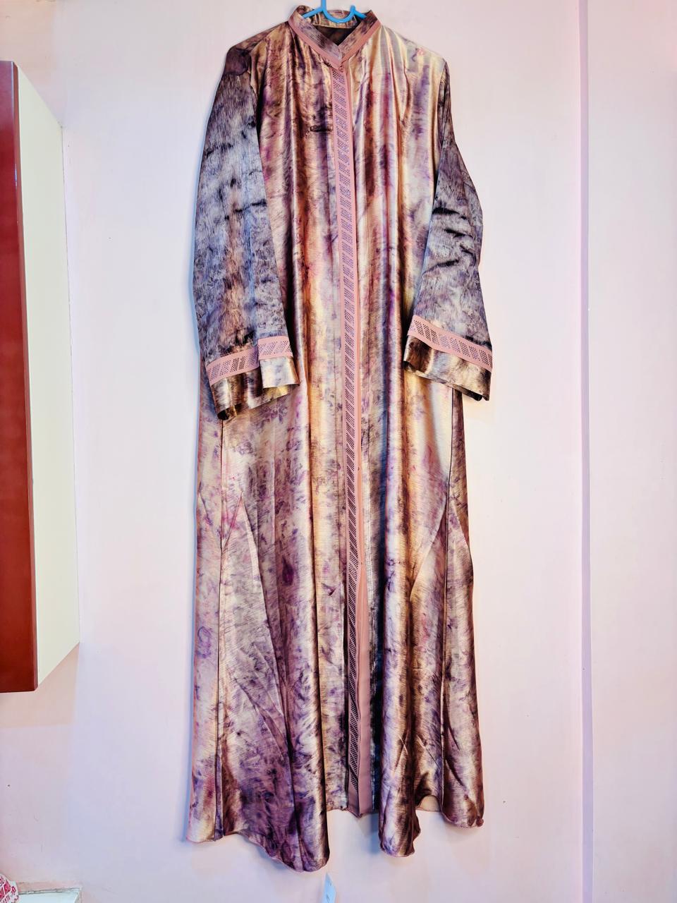 Soft satin hijab dress with smooth texture and elegant finish.