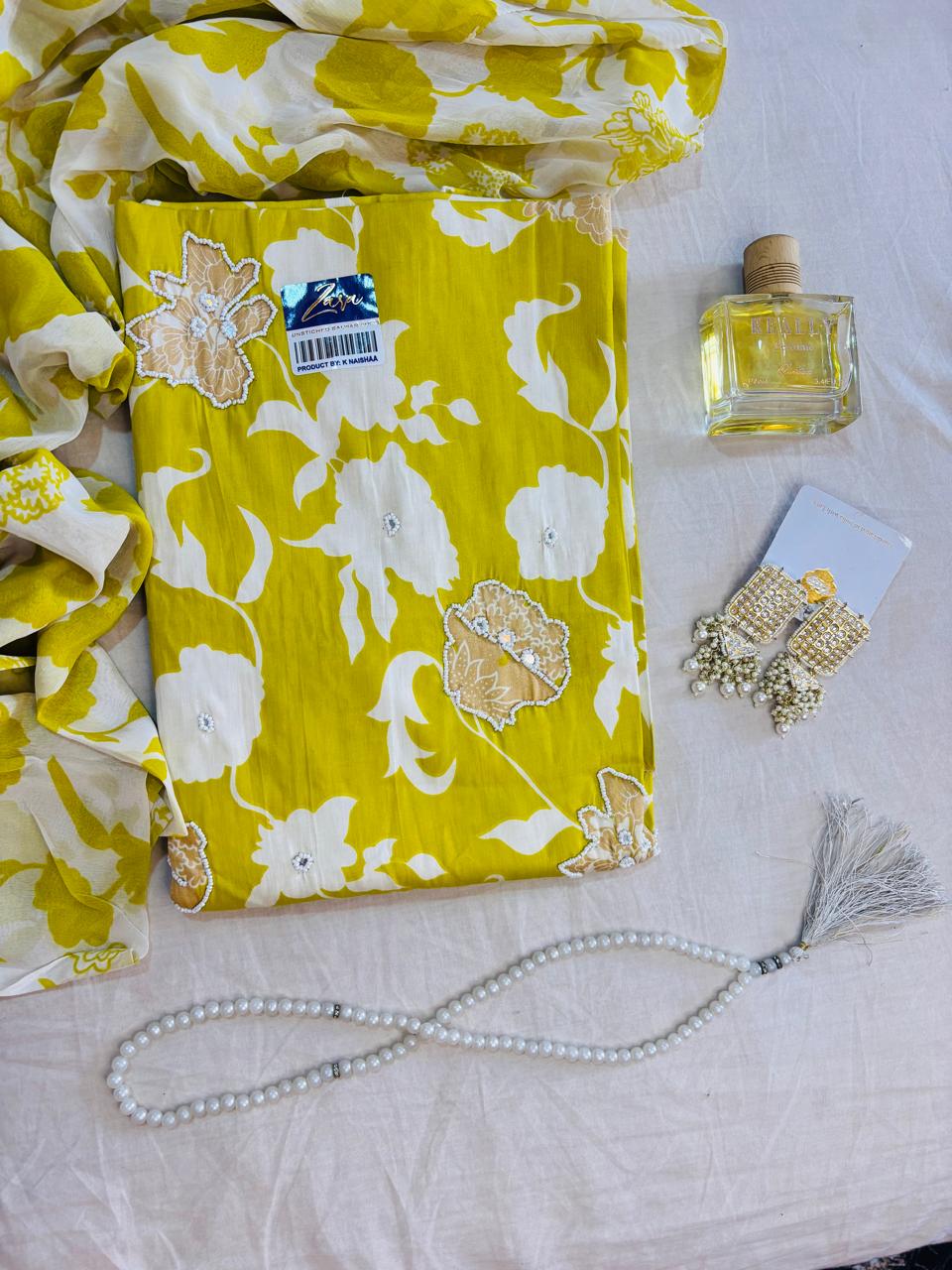 Bright yellow floral cotton suit set perfect for summer outings and daily wear.